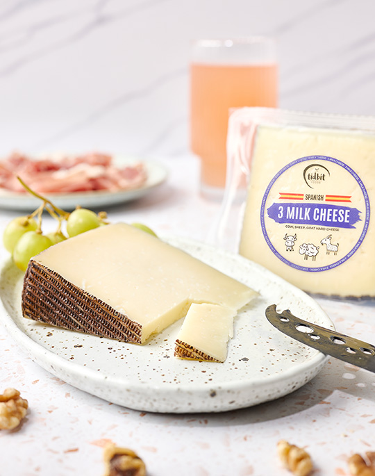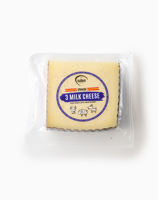 Pasteurised milk (Cow, Sheep and Goat’s Milk), Salt, Firming Agent (509), Lysozyme (1105 (Egg)), Enzyme (Animal Rennet).