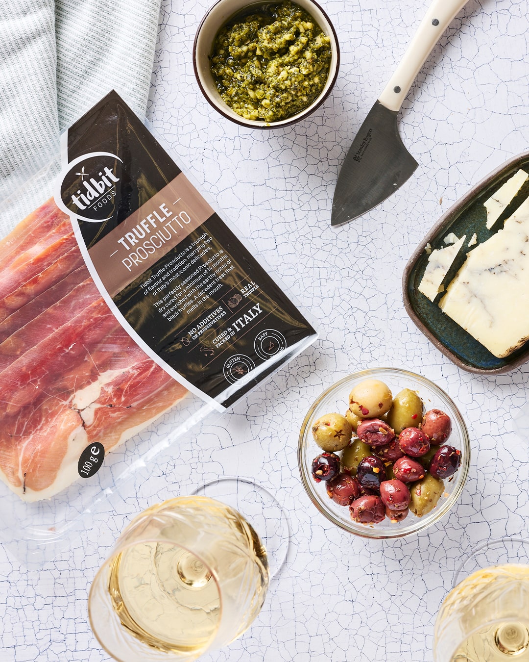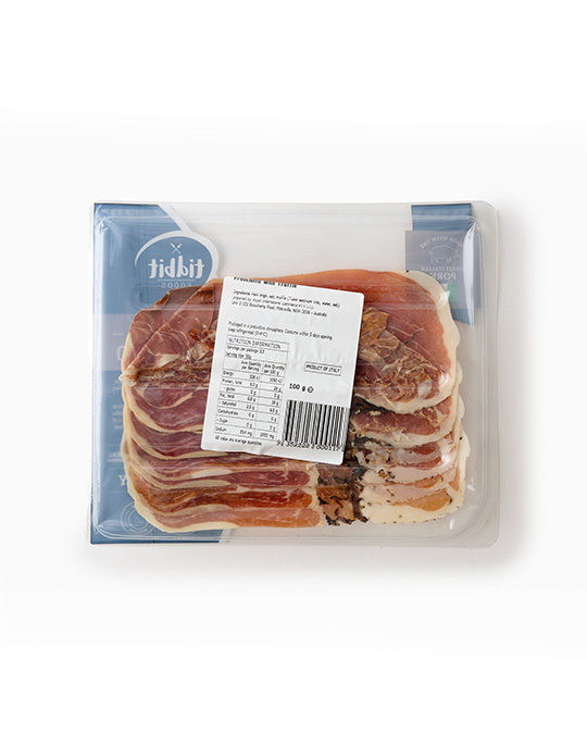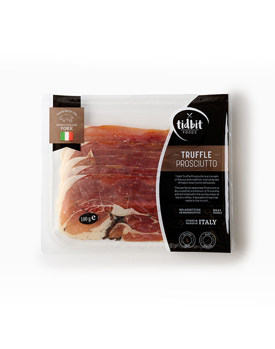Tidbit Truffle Prosciutto is a luxurious fusion of craftsmanship and indulgence, combining finely cured Italian prosciutto with the earthy richness of real black truffles. Dry-cured for a minimum of 14 months, this specialty cut delivers an aromatic depth and silky texture that melts on the palate.